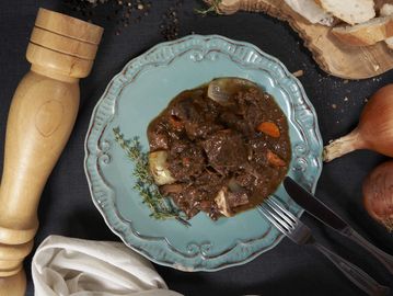 Tradicional de la cocina francesa, original de Borgoña que debe su nombre a sus dos ingredientes principales: la carne de ternera o buey y el vino. Preparación marinada por más de 24 horas en vino y además cocción lenta por 4 horas, para lograr ese sabor que algunos consideran la mejor preparación de carne creada por el hombre.